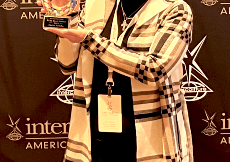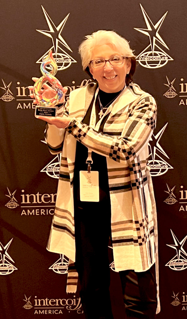 Cathy Pedulla was awarded the 2022 Sans Bias Award for dedication to Intercoiffure at the Intercoiffure America/Canada Atelier. This award is given to industry leaders of a lifetime of dedication to Intercoiffure.
